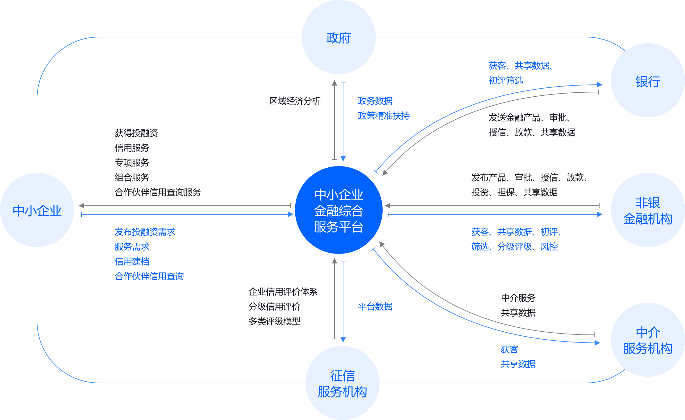 中小企业金融综合服务平台是各省市解决中小微企业融资对接、、、、融资增信、、政策支持、、、、融资评级的一站式金融综合服务平台。。。平台利用大数据、、、、人工智能技术,,构建统一的数据体系和评价体系,,并以信用为基础,,,实现政府、、、金融机构、、征信机构、、中介机构、、、数据提供方等金融服务主体全流程线上化信息共享、、专业分工、、、协同服务,,通过金融服务自动匹配、、、金融机构风险智能化管理、、服务多元化组合配套、、、、政策精准扶持等一系列方式,,极大缓解了中小微企业融资难,,,,融资贵问题。。